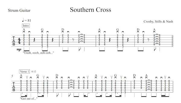 Strum Guitar Tablature for “Southern Cross” by Crosby, Stills & Nash.