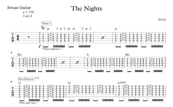 Strum Guitar Tablature for “The Nights” by Avicii.
