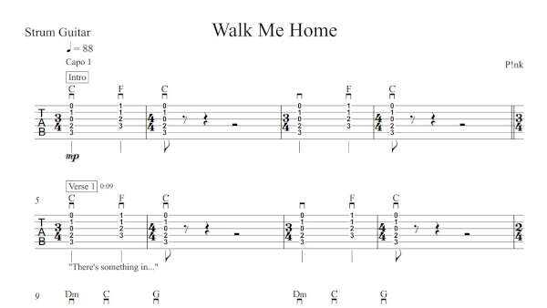 Strum Guitar Tablature for “Walk Me Home” by Pink.