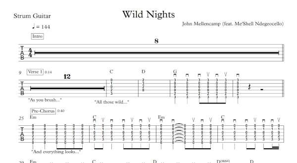 You need to be a member to be able to purchase this tab. Sign up nowStrum Guitar Tablature for “Wild Nights” by John Mellencamp (feat. Me’Shell Ndegeocello).