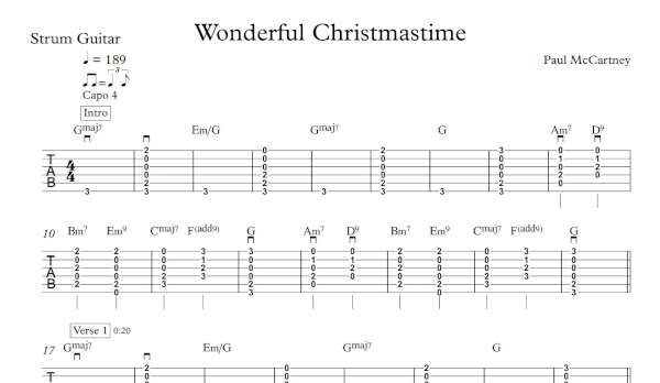 Strum Guitar Tablature for “Wonderful Christmastime” by Paul McCartney.