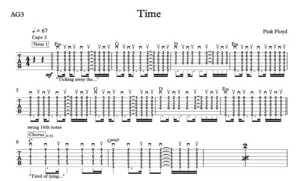 Strum Guitar Tablature for “Time” by Pink Floyd