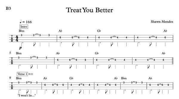 Bass Guitar Tablature for “Treat You Better” by Shawn Mendes