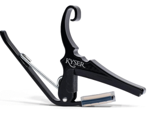 The Kyser Quick-Change Capo is known for its simplicity and efficiency. It features a spring-loaded design, making it easy to attach and remove from the guitar neck with just one hand. The capo is made of durable materials, ensuring it can withstand regular use.